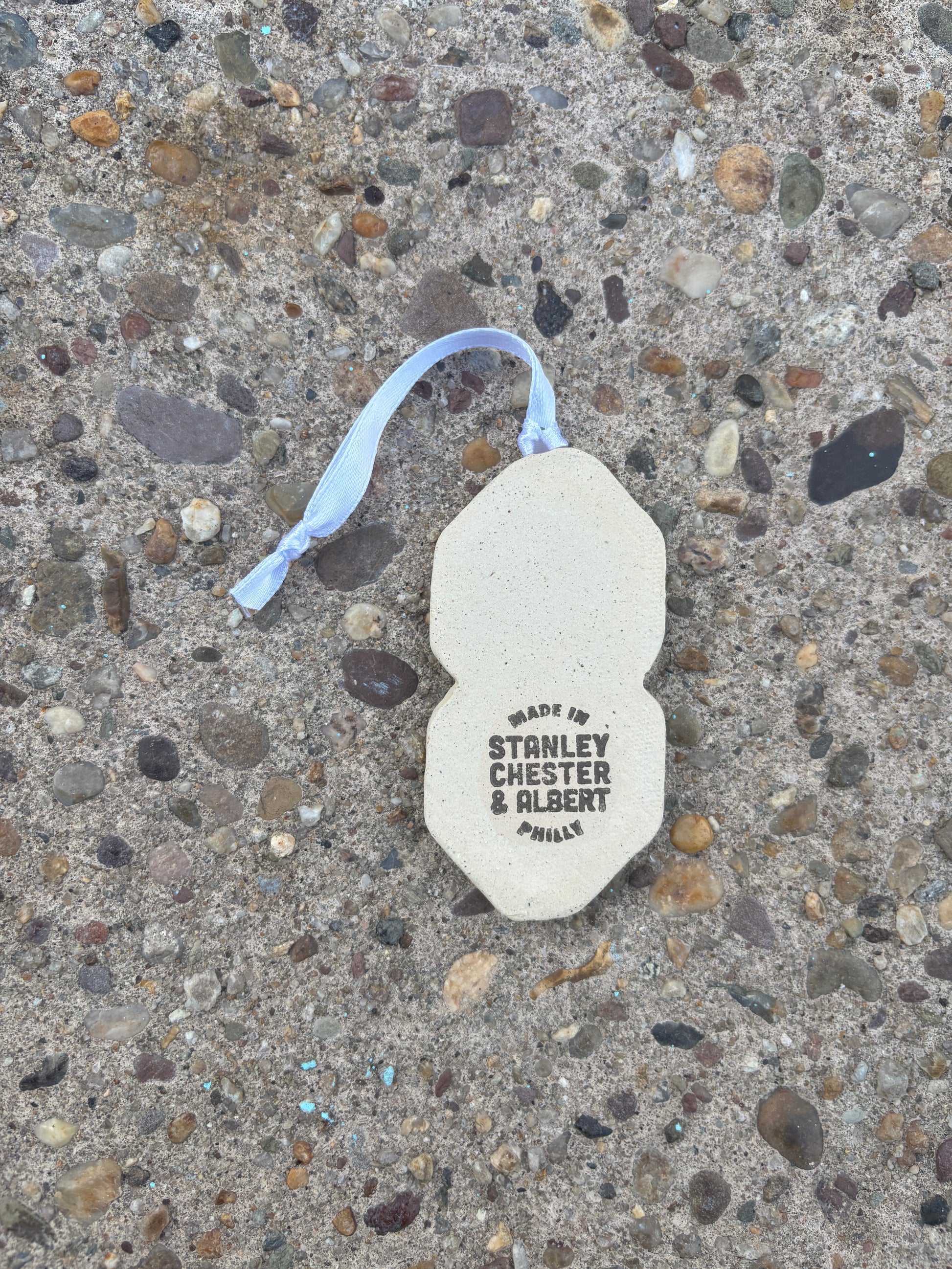 The ornament measures approximately 1”x2.5” and comes with a white satin ribbon for hanging.